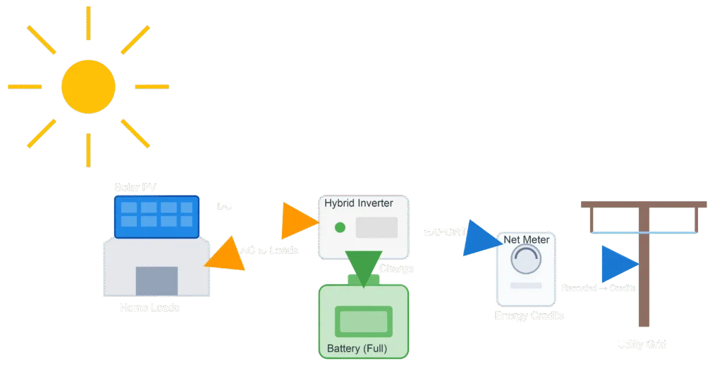 Surplus power is exported to the grid, often earning feed-in tariff credits.